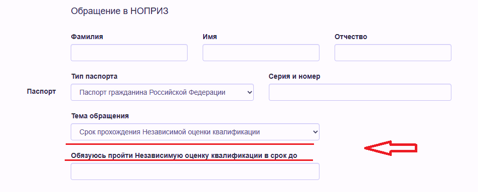 Для подачи обращения, в котором специалист по организации подготовки проектной документации и/или по проведению инженерных изысканий берет на себя обязательство пройти оценку квалификации, необходимо указать планируемую дату сдачи профессионального экзамена в аккредитованном Центре оценки квалификации или Экзаменационном центре.